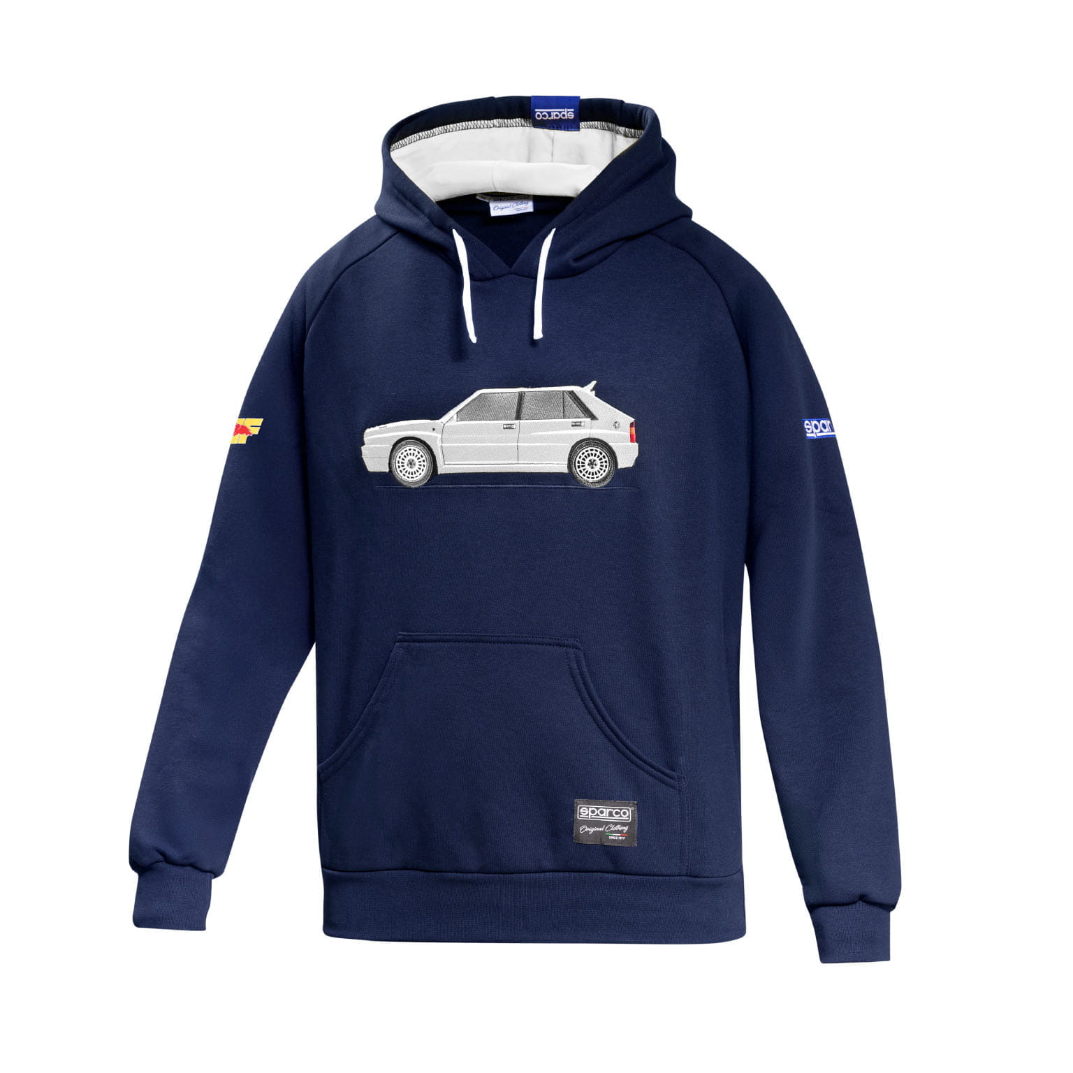 Felpa con cappuccio Lancia Delta HF Integrale Sparco. Felpa personalizzata Lancia Delta HF Integrale a ricamo diretto con cappuccio e tasca. Questa felpa, realizzata in 65% cotone e 35% poliestere, offre il perfetto equilibrio tra comfort e stile, assicurando una vestibilità ottimale. Disponibile nel colore Blue Navy.